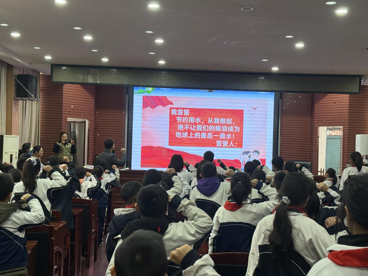 活动结束之际,在绿色卫士们的引领下,校领导与各班级同学一同受邀参与宣誓。大家纷纷高举右手,神情庄重且坚定,齐声许下承诺:“节约用水,从我做起,绝不让我们的眼泪成为地球上的最后一滴水!”宣誓声掷地有声,在活动现场久久回荡,也深深铭刻在每个人的心中。