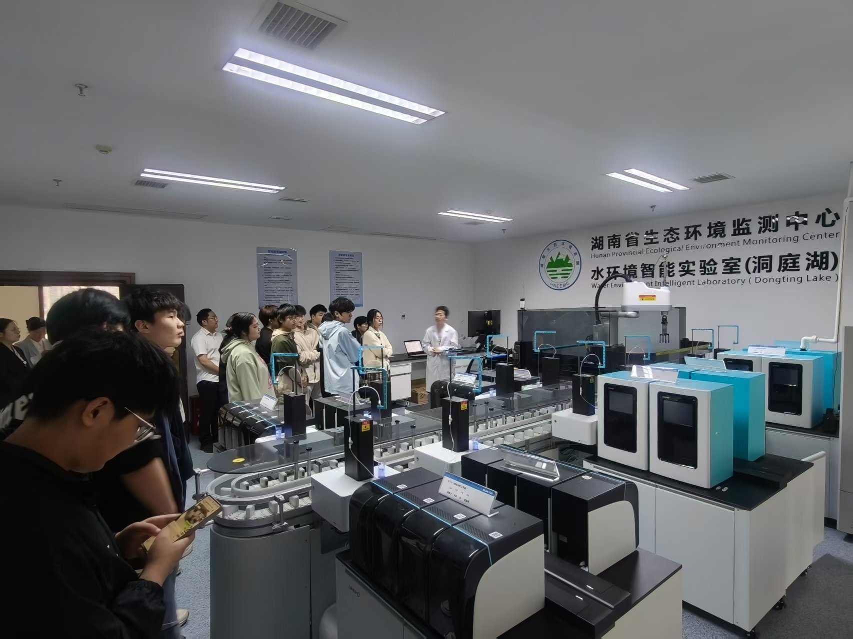 本次活动的亮点,当属是集全自动水质分析、样品传输、智能中控于一体的“AI黑灯”水环境智能实验室。该实验室室内无人值守,机械臂精准作业,依靠AI智能管理实现全流程自动化监测,高效又精准。前沿科技让同学们连连惊叹,也点燃了大家投身环保事业的热情与向往。