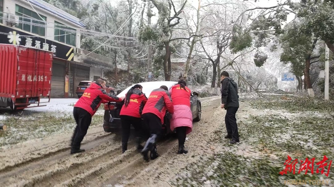 面对雨雪天气,益阳市东部新区志愿者协会党支部组织党员志愿者,赴319国道鱼形山街道灵宝山路段(麒麟广场门口)开展扫雪除冰行动,面对降雪导致的路面结冰、车辆打滑难题,志愿者们身着红马甲、佩戴党员徽章,手持工具清扫积雪、铲除积冰,合力助推打滑车辆脱困,快速恢复道路畅通。
