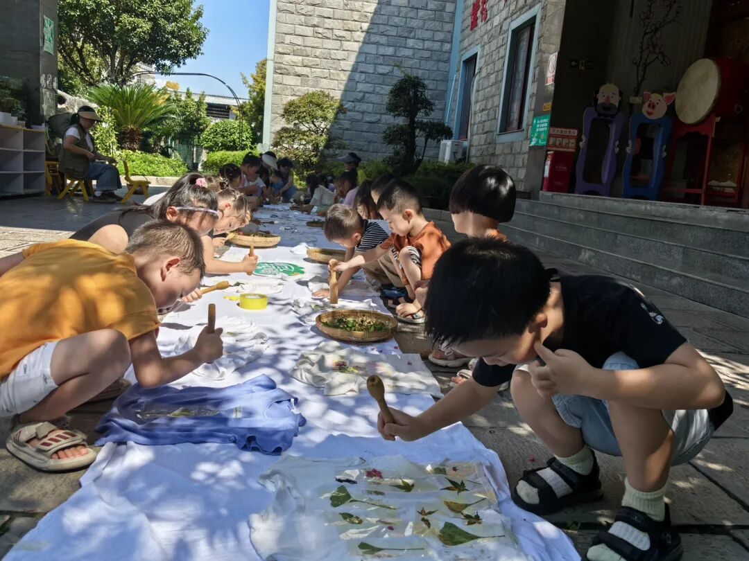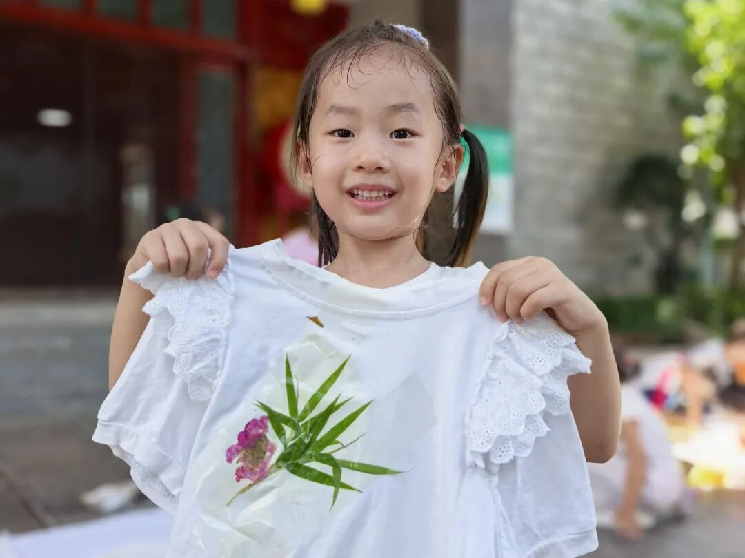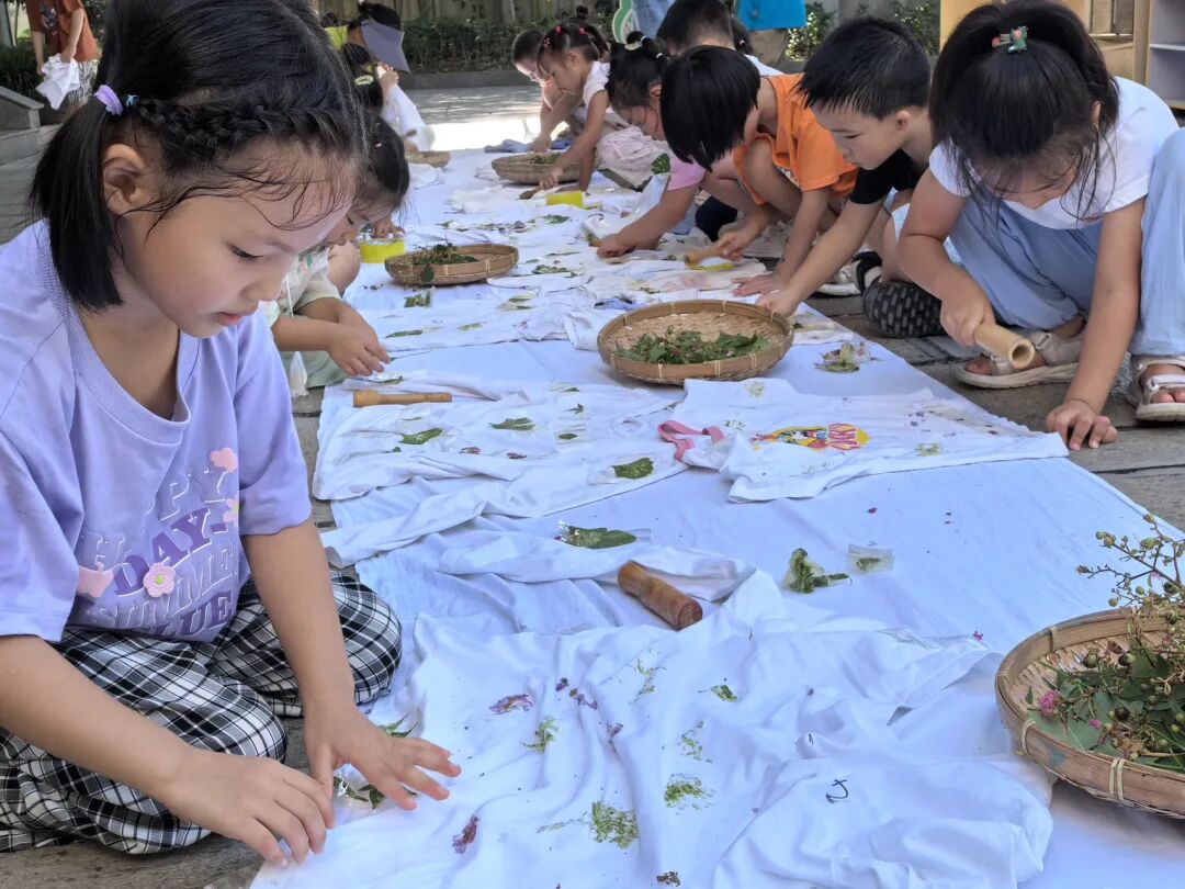 随后的实践环节深度融入“变废为宝”理念:分发幼儿提前准备的闲置旧T恤,天然落叶、安全小锤等材料,手把手教孩子们拓染——通过挑选叶片、固定造型、轻轻敲击,叶脉的纹理与色彩逐渐印在旧布上,原本无用的旧T恤将变成独一无二的创意汗巾;志愿者还特意告诉孩子们“这些落叶后续会送去堆肥,变成滋养植物的肥料”,让孩子们亲身感受“旧物重生”的意义,也理解资源循环的价值。