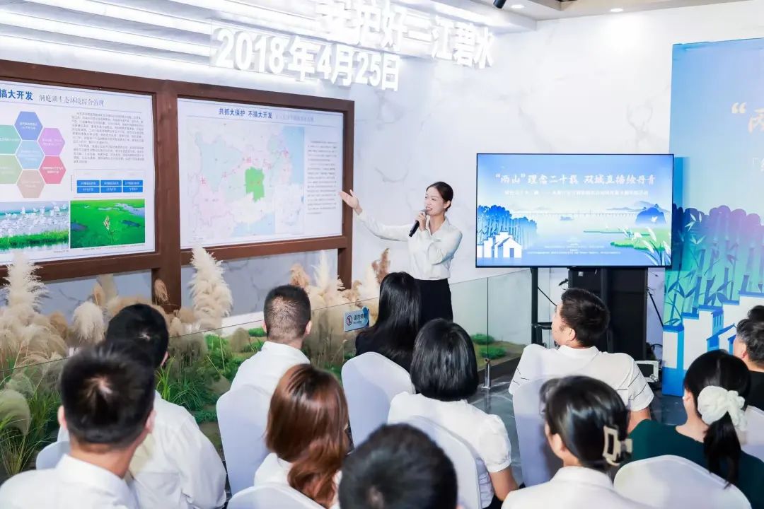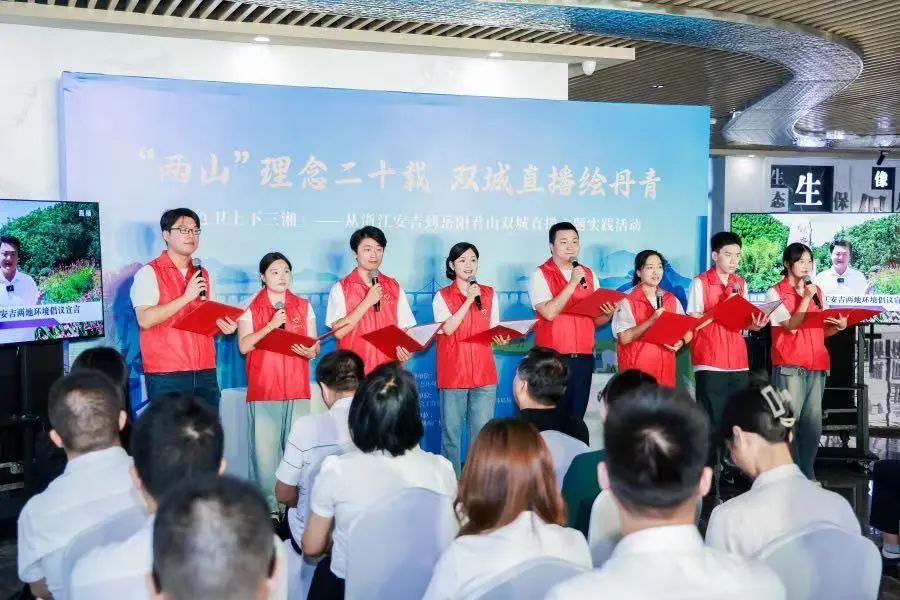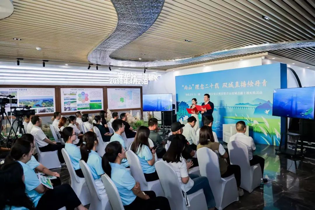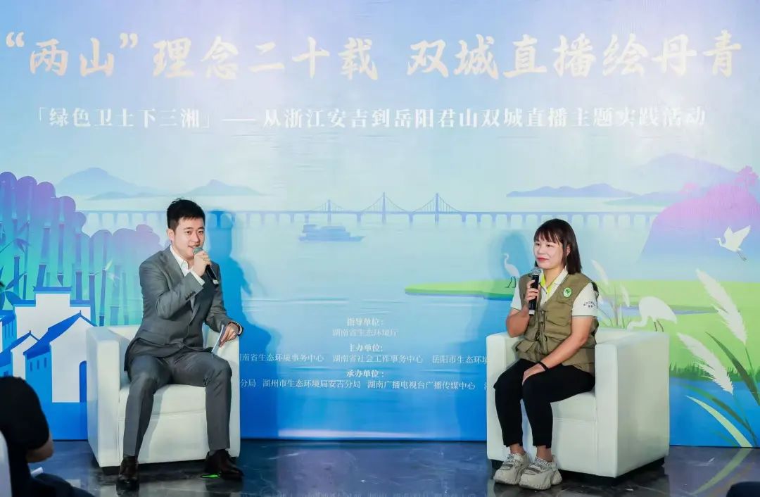 活动以“两山理念二十载,双城直播绘丹青”为主题,通过美丽中国我先行主题宣传片回顾生态环境志愿者在生态文明宣传实践中的精彩历程。君山、安吉两地生态环境志愿者共同发出“公民生态环境行为规范十条”公益倡议,凝聚起全民保护环境的共识。“江豚格格”谭格作为第十届“母亲河奖”绿色卫士奖,受邀分享了自己守护江豚的故事。音诗画《美丽中国 洞庭欢歌》用语言艺术精彩呈现生态蝶变。跨省联动环节中,安吉县融媒体中心主持人连线视频讲述,从总书记提出“绿水青山就是金山银山”理念的科学论断到学习贯彻习近平生态文明,浙江安吉从“一片树叶”为切口,走过的“点绿成金”之路,成为“两山”理念的鲜活注脚。湖南东洞庭湖国家自然保护局相关负责人解读东洞庭湖生态蝶变。浙江安吉、湖南君山双城联动搭建了经验互鉴的桥梁,用鲜活的案例、身边的典型、生动的体验,践行习近平生态文明思想,共同谱写生态文明建设的崭新篇章。