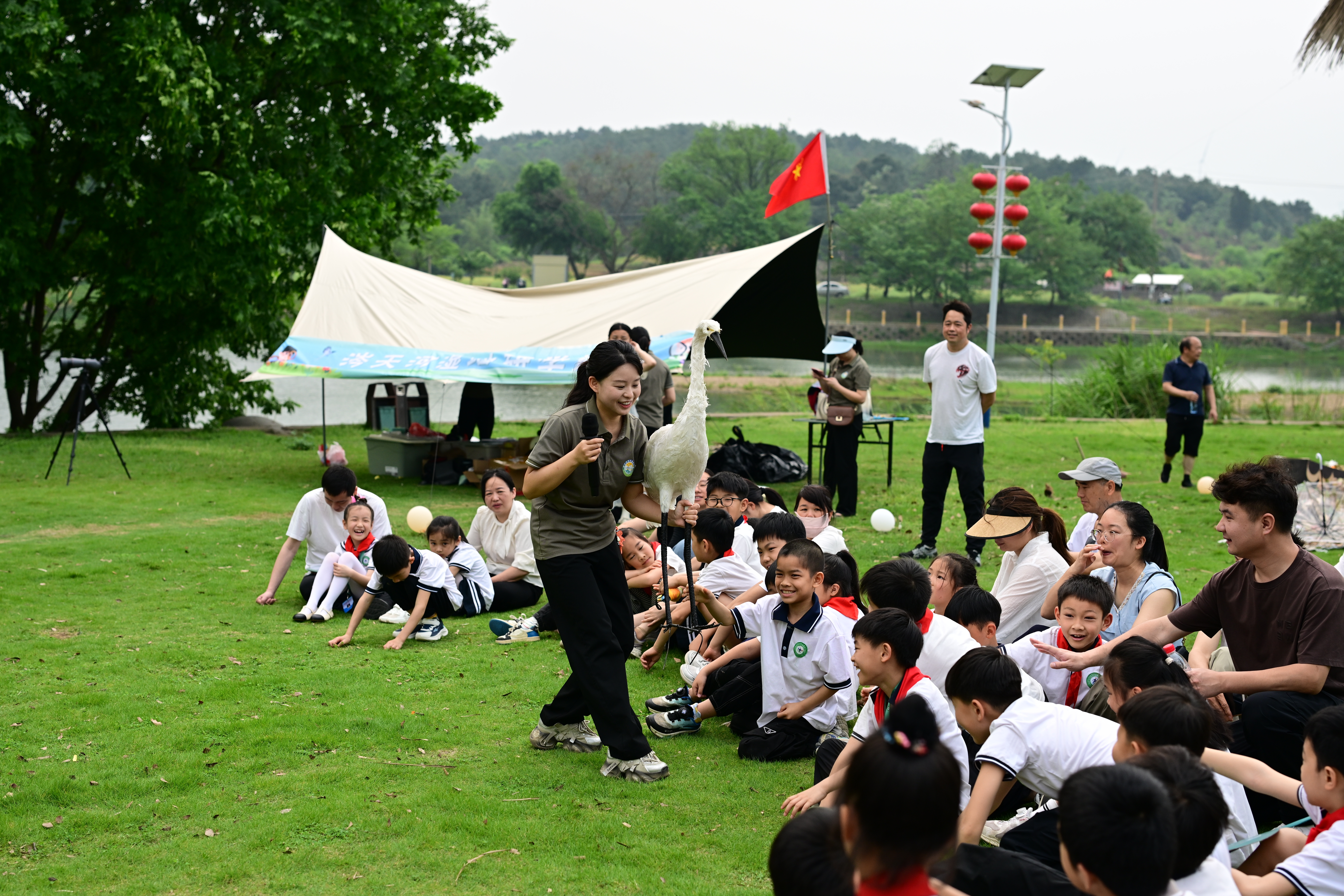 4月11日,伴着清脆鸟鸣与融融春光,湖南省生态环境教育和科普基地、江华涔天河国家湿地公园格外热闹,50组亲子家庭齐聚于此,共同开启以“守护飞羽精灵 共绘生态画卷”为主题的爱鸟周趣味研学之旅。