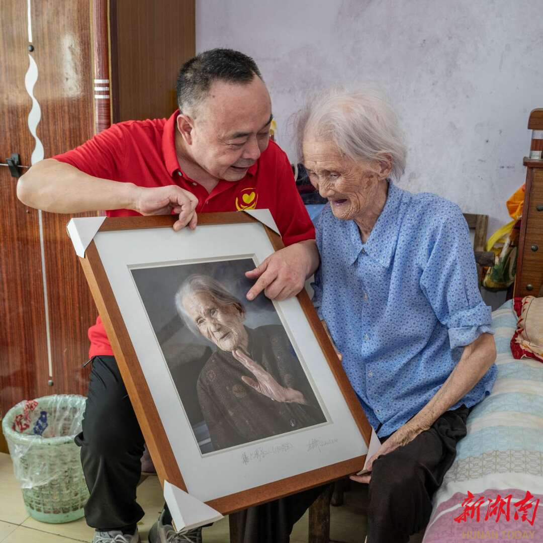 104岁的世纪老人杨奶奶,始终是华容县爱在始终志愿者协会的重点关怀对象。今年,协会配合知名摄影师王琦平开展“为百名百岁左右老人留存时光印记”公益行动。画面中,志愿者正将装裱精美的照片送到杨奶奶手中,老人凝望照片里神采奕奕的自己,眼眸中漾起孩童般纯粹的喜悦。