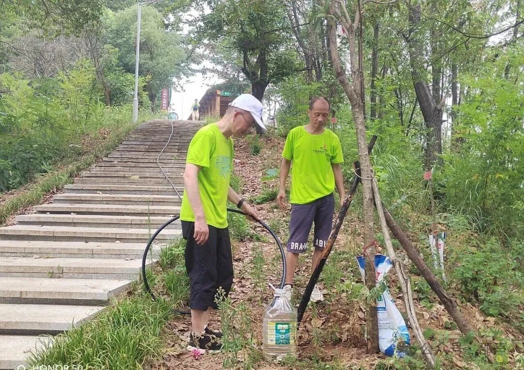 第二道难题是水。佘湖山山高坡陡,没有水源。联合会秘书长胡浴明挨家挨户敲门,最终说服山脚下的老张提供水电。他自己掏钱买水泵、水管、储水罐,一肩扛起了灌溉系统的搭建。