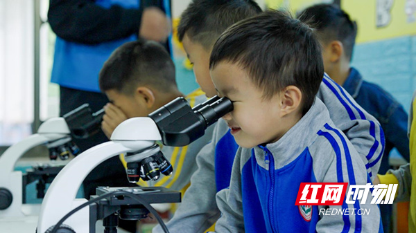 ▲孩子们用显微镜观察微观世界。