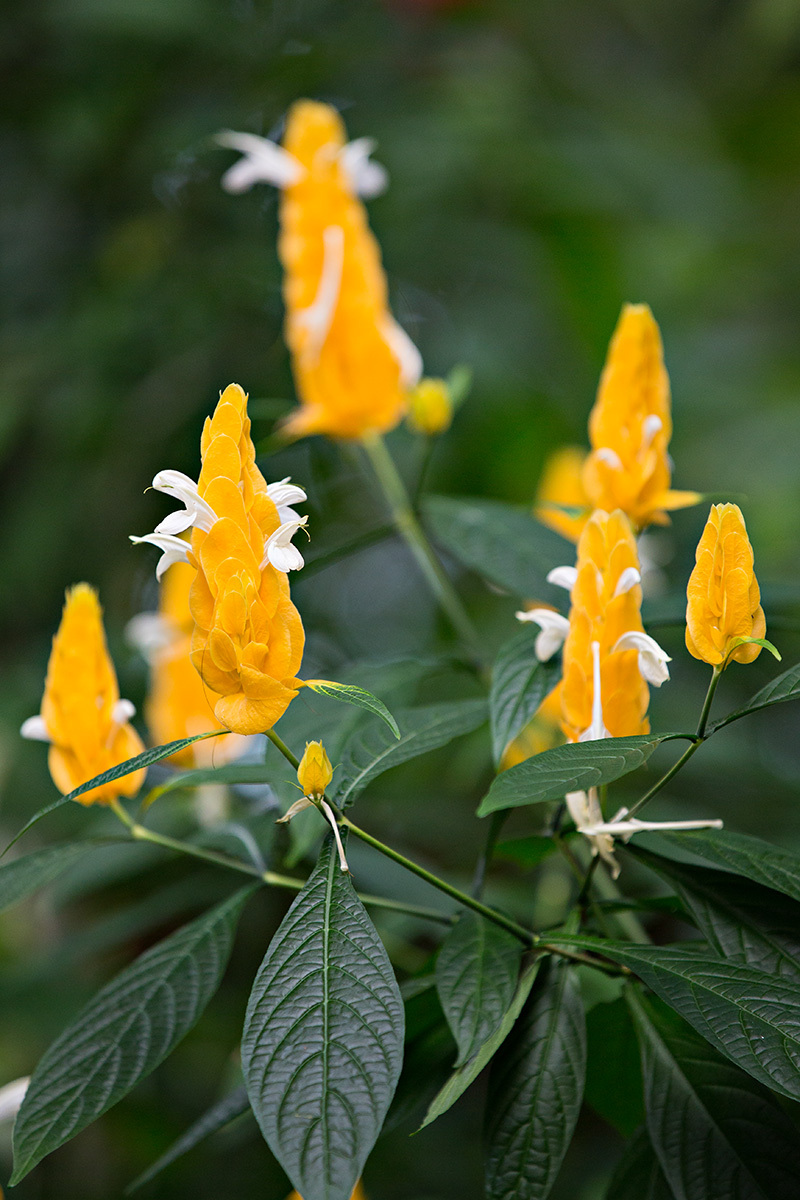 金苞花原产于南美洲的秘鲁,常吸引当地的蜂鸟授粉。虽说苞片有多少,花就能开多少,但金苞花的花不会一次开完,而是由底部往上逐次盛开。为的就是延长花期,始终保持着对授粉传媒的吸引力。