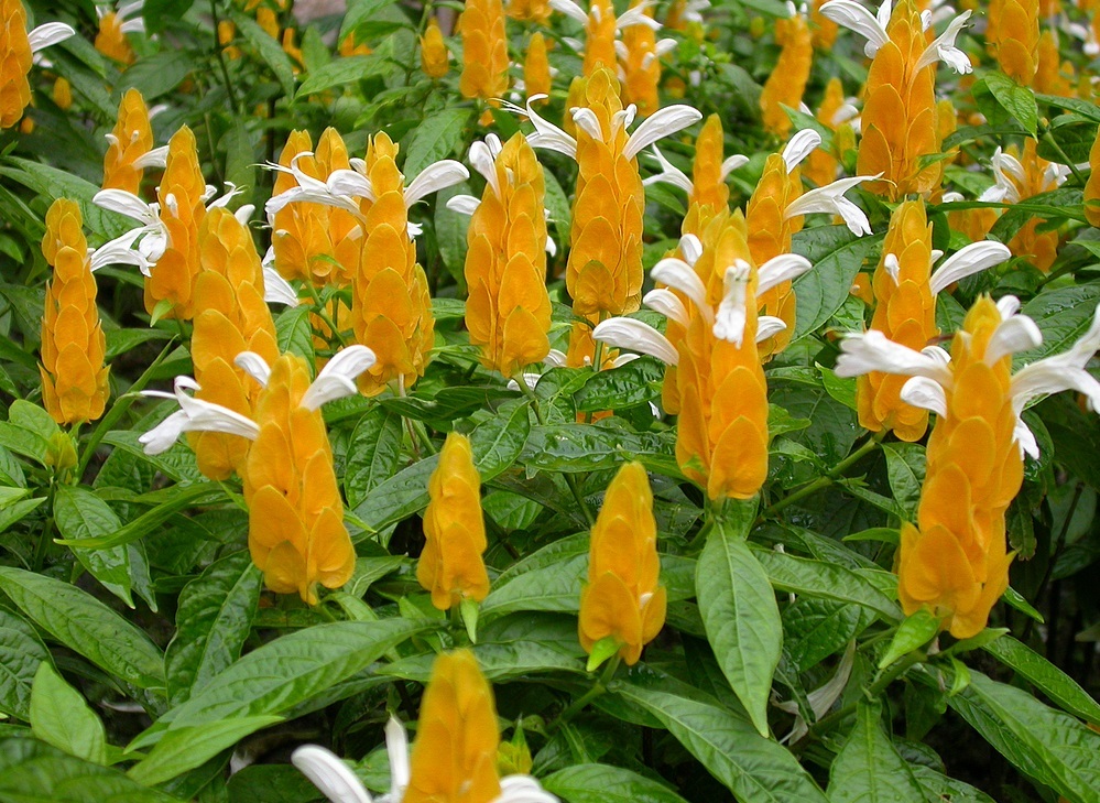 金苞花鲜黄色的苞片层层叠叠,从中伸出的白色花冠才是它真正的花。远望金苞花,如矗立的金色宝塔,近看如活蹦乱跳的虾子,故又得名“黄虾花”。