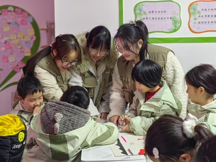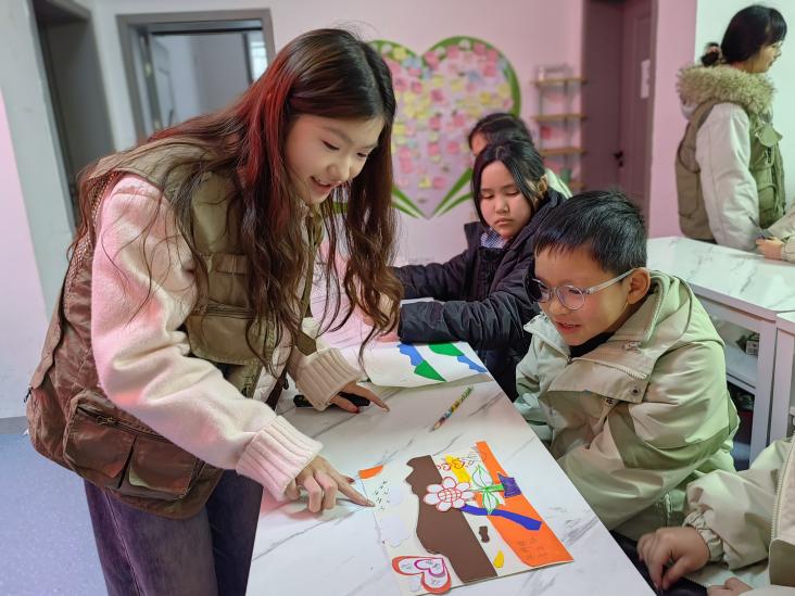 活动从一堂绘画课开始。大学生志愿者舒琼老师带来了《湿地生态好》创作课,为孩子们打开了认识湿地的一扇窗。课堂上,舒老师不仅带大家欣赏鄱阳湖等湿地的风景,讲解湿地作为“地球之肾”的重要作用,还把美育和生态知识结合起来,——从最基础的三原色讲起,演示如何调色,一步步引导孩子们用画笔和彩纸描绘心中的湿地。创作过程中,孩子们都很专注,互相帮忙:有的孩子画下芦苇摇曳的湿地轮廓,有的孩子用彩纸贴出五彩花朵装点家园……绘画过程中大家互帮互助,。小程同学积极帮忙整理画具;小瑞和小林在志愿者指导下完成了带有爱心元素的湿地画,用纯真的笔触表达了对大自然的热爱。展示环节,孩子们纷纷介绍自己的作品:“我画的是思蒙湿地的候鸟”“希望湿地永远绿绿的”,……用稚嫩的话语里满是表达了对家乡湿地的感情热爱。