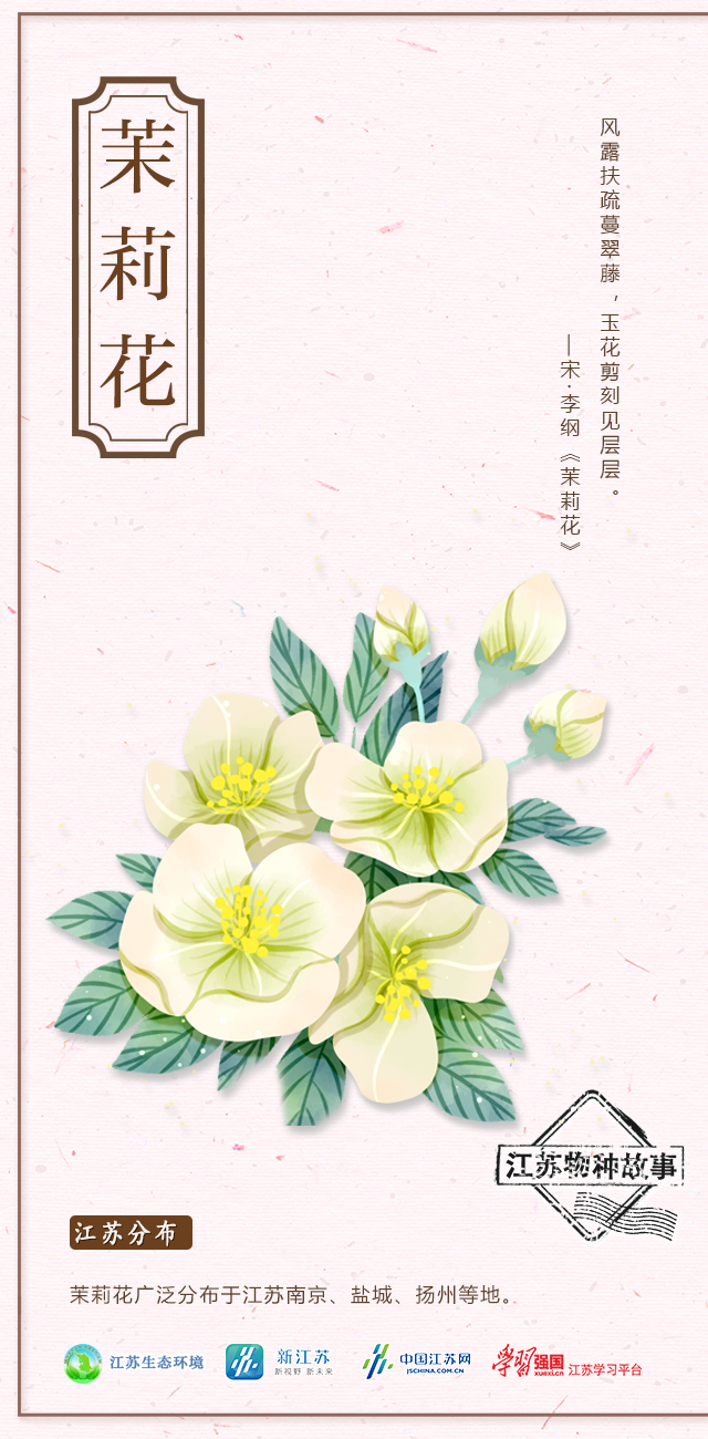 茉莉花广泛分布于江苏南京、盐城、扬州等地。