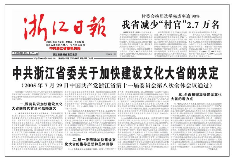 2005年7月,中共浙江省委召开十一届八次全体会议,审议并通过《中共浙江省委关于加快建设文化大省的决定》,明确提出实施文明素质工程、文化精品工程、文化研究工程、文化保护工程、文化产业促进工程、文化阵地工程、文化传播工程、文化人才工程等“八项工程”。 浙江省委宣传部供图