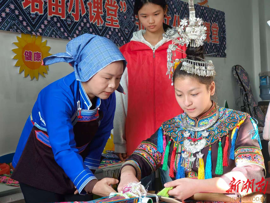 通道侗族自治县非遗宣传志愿者们带领“青少年雷锋”触摸侗锦经纬、学唱古老童谣、轻拨琵琶琴弦,以动手、开口、入心的方式,让侗族文化织入青少年未来。