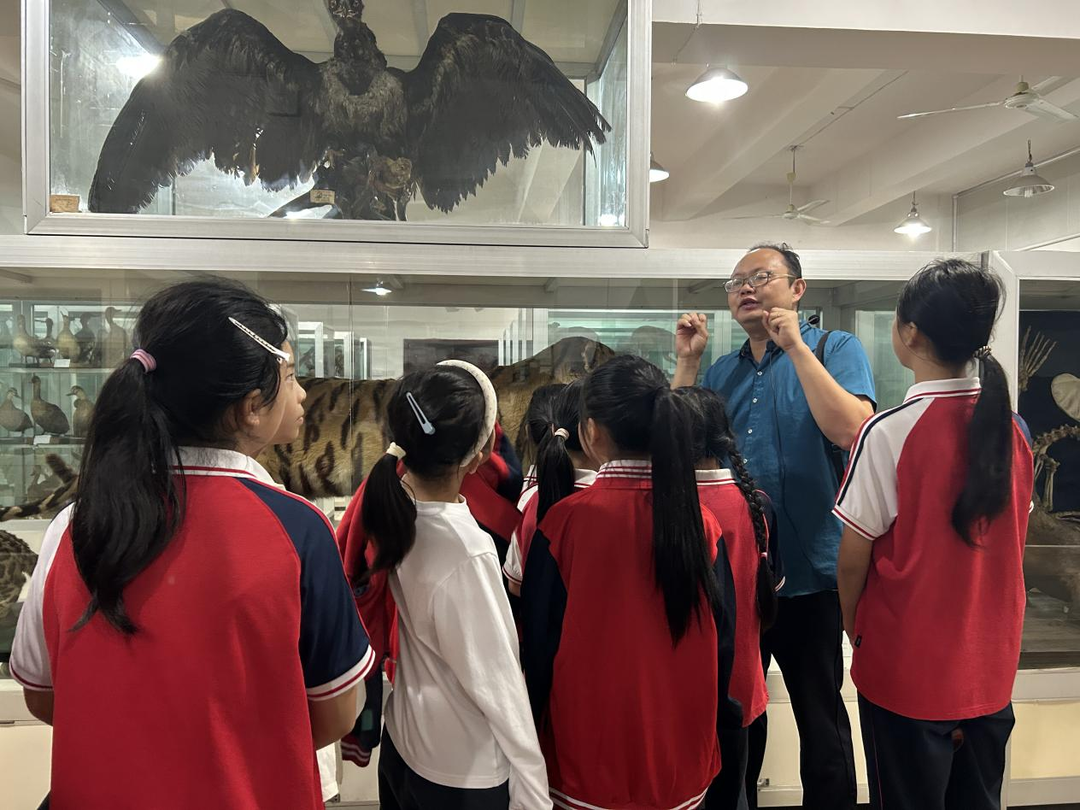 “第一组的同学请跟我来!”本次活动在湖南师范大学生命科学学院云植物标本馆举行。来自长沙市岳麓区新民小学星火萌芽(科普)社的60名“星火少年”被分为四个小组,以“大手牵小手”的形式,在湖南师范大学生命科学学院志愿者的讲解和带领下,依次参观了鸟兽馆、两爬馆、无脊椎馆和植物馆四大主题展馆。