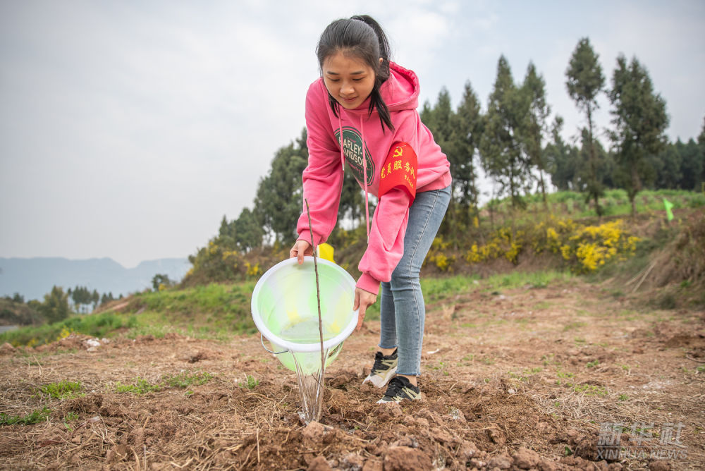 2022年3月10日,在重庆市渝北区木耳镇金刚村,参加助农植树活动的志愿者为刚栽种的树苗浇水。