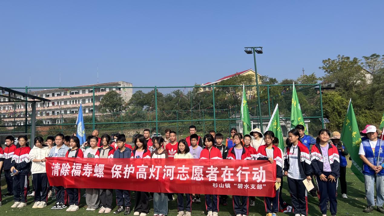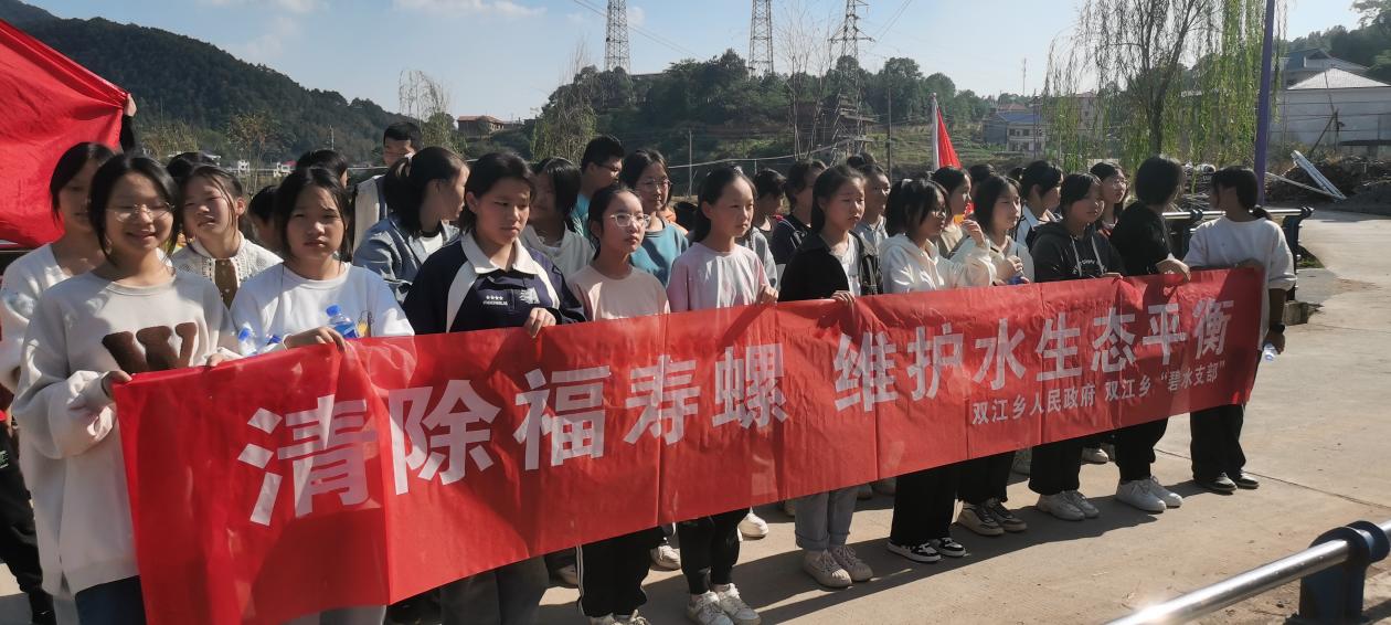 为积极推动福寿螺清除,防控福寿螺带来的危害,做好外来物种防治工作,保护水域环境和生态系统安全,10月30日,共青团娄星区委、娄星区水利局娄星区河长办、杉山镇人民政府、双江乡人民政府、高登河风景管理处的支持指导下,娄底市环保志愿者协会、娄星区河小青行动中心组织杉山中学、双江中学河小青志愿者开展“保护水资源、维护生态平衡”福寿螺清理行动