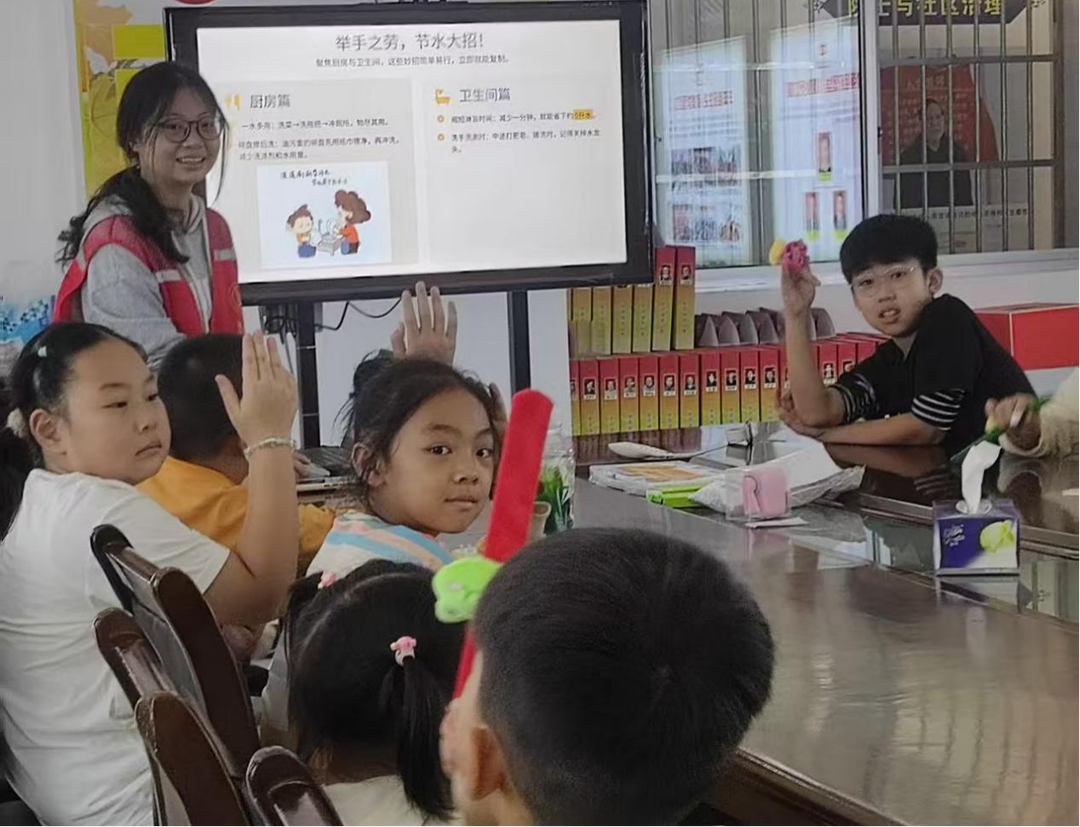 “视频里的小卫士用什么水擦拭家具?”“洗漱时怎样避免水龙头一直流水?”在互动问答环节,志愿者接连抛出与视频内容紧密相关的问题,青少年们踊跃举手、争相抢答。回答正确者还能收获节水主题文具、卡通水杯等小奖励,让知识学习不仅有收获感,更添一份趣味与成就感。