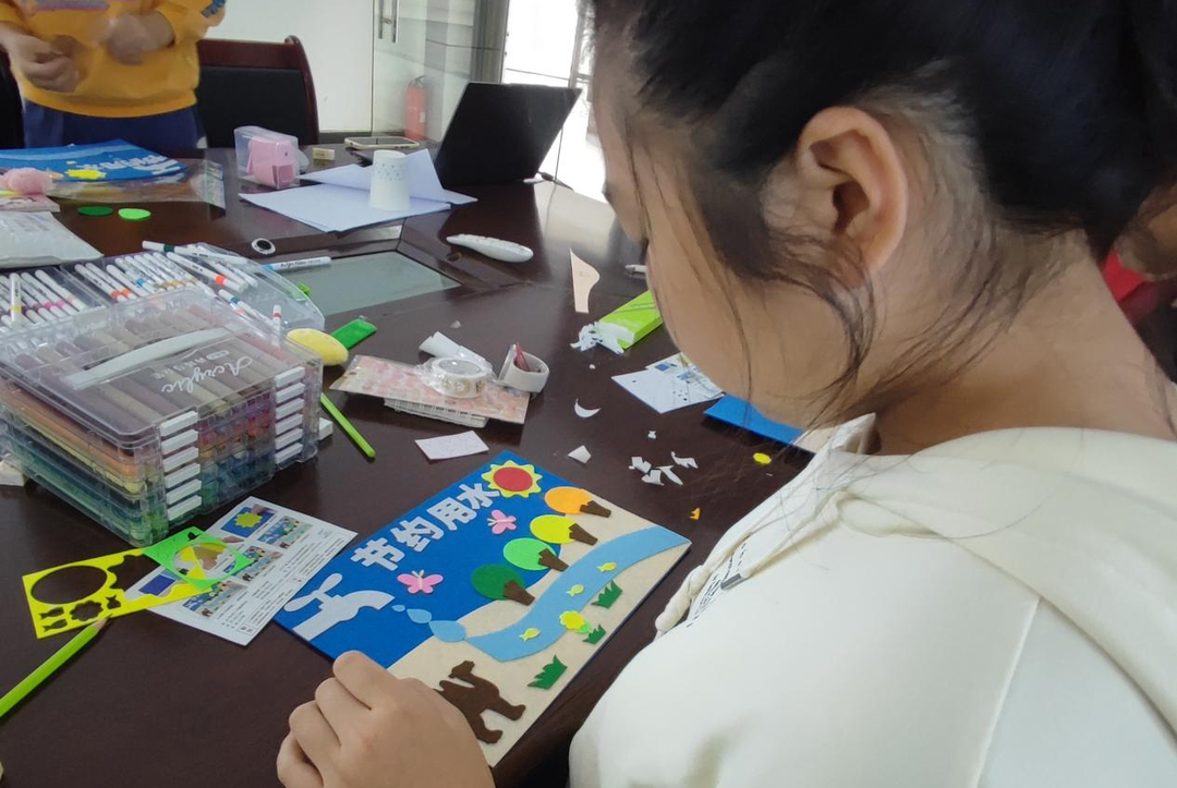 最受孩子们喜爱的当属节水手工制作环节。在社工和志愿者的共同指导下,青少年们手持塑料瓶、吸管、彩纸等材料,认真裁剪、粘贴、组装,亲手制作简易节水花洒和废水回收桶。“我要把这个节水花洒装在家里的水龙头上,洗澡就能省好多水!”“我的回收桶要用来装洗水果的水,浇我家的小绿萝”,孩子们举着自己的作品分享节水计划,眼中满是对践行环保理念的期待。