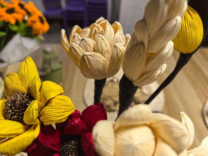 活动中,绿色卫士们的首要任务是帮赵明健家抢收玉米。田间地头里,大家分工协作,抢收、搬运、剥壳,金黄的玉米穗堆成小山,忙碌的身影里满是对模范的敬意。剥玉米时,大家特意将完整的玉米叶细心收集——这些以往可能被焚烧或丢弃的“废弃物”,正是生态环保实践的关键:它们将被制成坐垫、草鞋、手工花等实用物件,实现“变废为宝”的循环利用,让每一片玉米叶都发挥新价值。