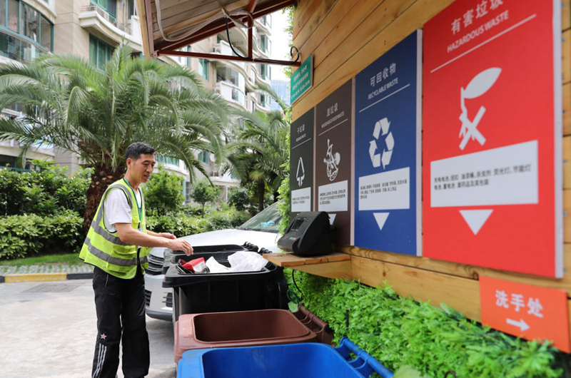 ↑在上海市虹口区嘉兴路街道“宇泰景苑”小区,保洁员对居民分类投放的生活垃圾进行分拣(2019年6月24日摄)。