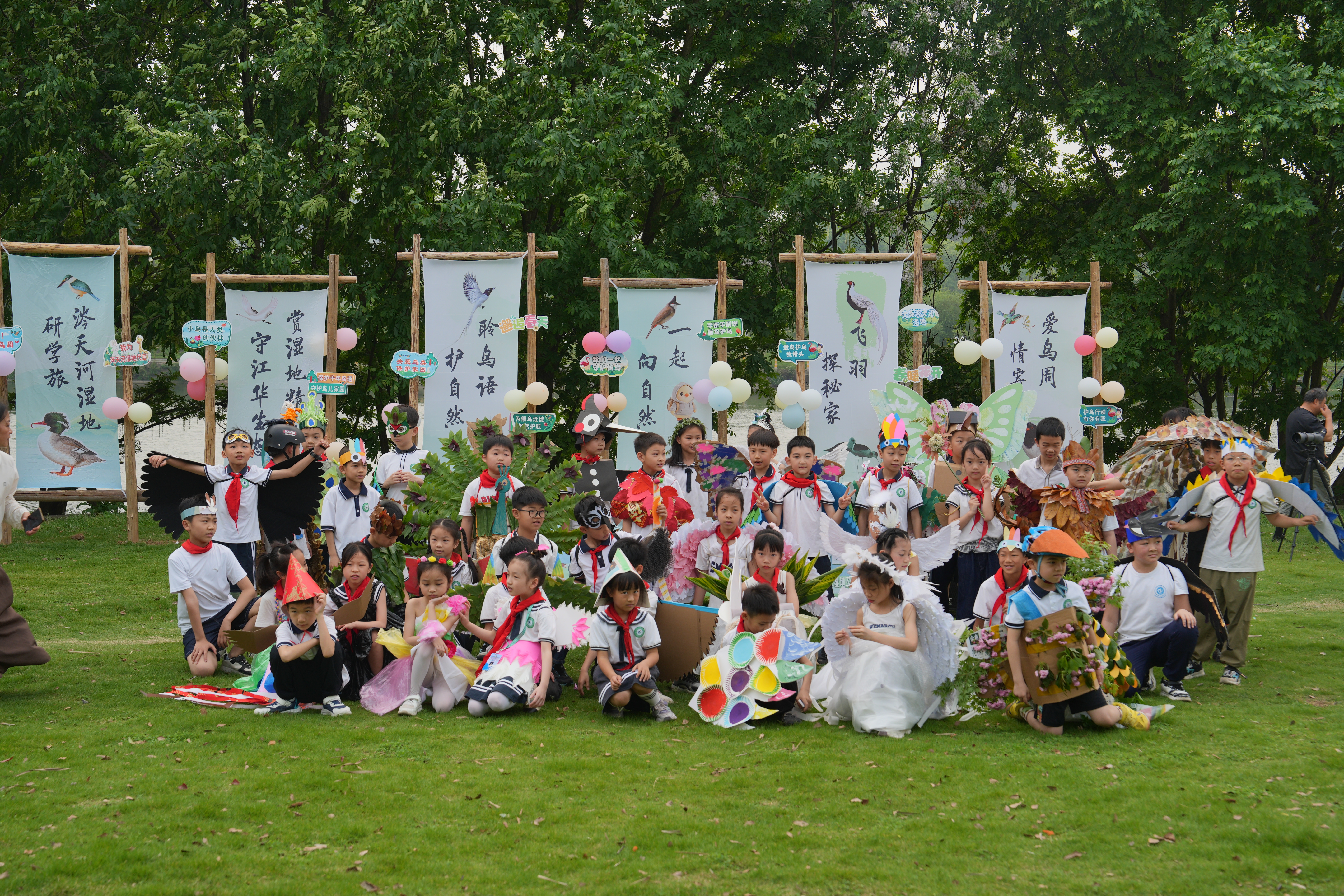 活动在“羽众不同”创意环保时装秀中拉开序幕。孩子们身着利用报纸、塑料袋、落叶等废旧材料制作的服装,惟妙惟肖地模拟鸟类形态,自信展示创意与环保理念的完美结合,展现飞羽之美。