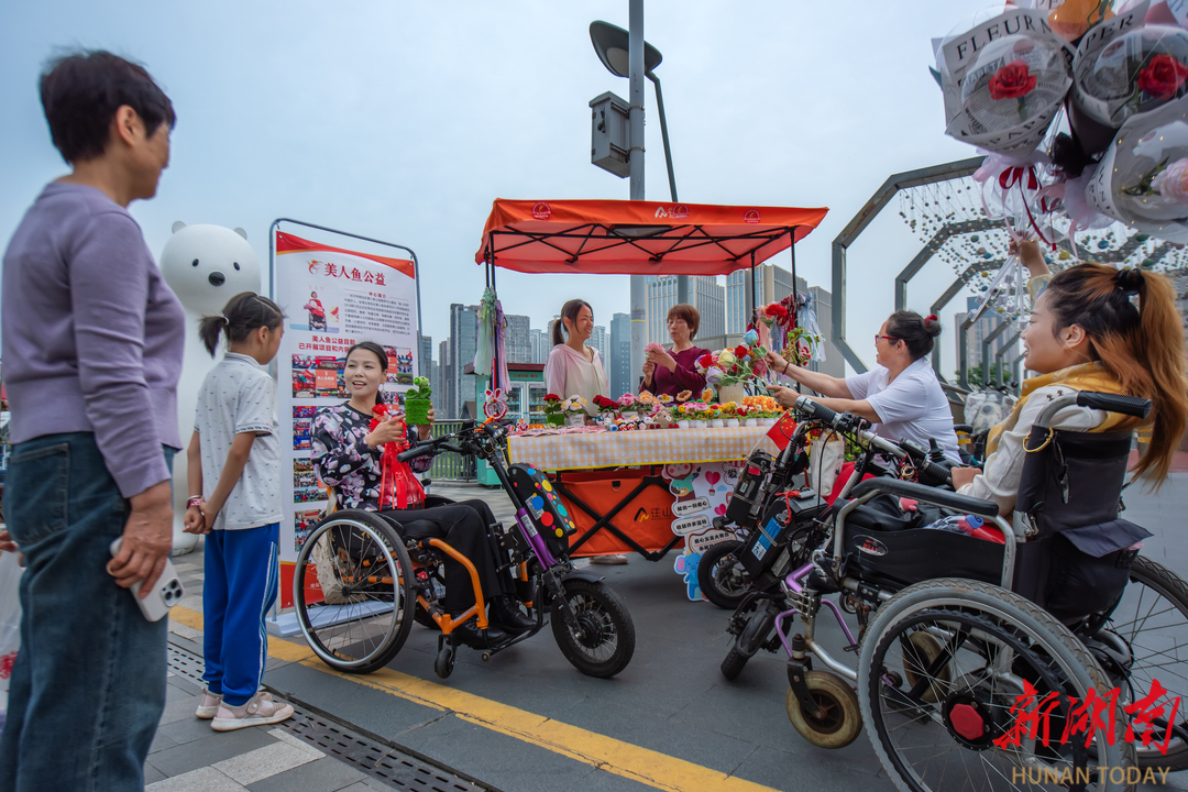 近期,美人鱼公益开展手工助残项目,售卖手工花、手工气球、山水国画等产品。图为中国好人肖卓作带残友在摆摊销售残友们的作品。