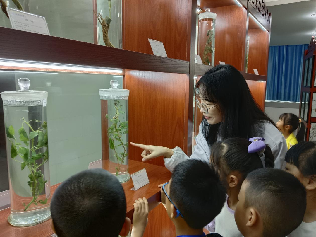 “大家看这株还魂草,干旱时它会蜷缩成‘枯草’,遇水却能迅速舒展复活,这就是它顽强生命力的秘密……”药学院博士郑冉结合标本实物,细致讲解每种植物的根、茎、叶、花、果实、种子等入药部位,更穿插“灵芝被誉为‘仙草’的古老传说”“人参生长的生态条件”等趣味知识。孩子们认真聆听、不时提问,在观察与互动中深刻体会到:每一份标本都是自然馈赠的瑰宝,保护生物多样性不仅是守护生态,更是为中医药传承与人类健康留存“宝贵财富”。