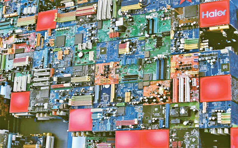 我国实施全面节约战略,大力发展循环经济。图为2024年9月27日,在海尔绿色再循环互联工厂展厅内拍摄的用废旧电路板制作的装饰墙。海尔绿色再循环互联工厂每年可拆解废旧家电200万台,再生循环新材料约3万吨。新华社记者李紫恒/摄