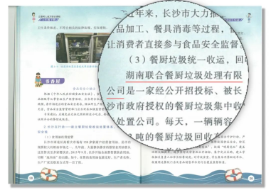 仁和环境公司长沙市餐厨垃圾收运处理项目对餐厨垃圾进行无害化处理,全面实现了资源化利用,杜绝了地沟油、潲水油回流餐桌,做到了为食品安全保驾护航。这不,湖南省已经将这个民生项目编入了小学《立德树人》教材,通过校园、课堂,让孩子们进一步了解如何保障食品安全,了解垃圾分类和资源回收的重要意义。(以下图片选自湖南教育出版社《立德树人地方综合课程》教材六年级下册)