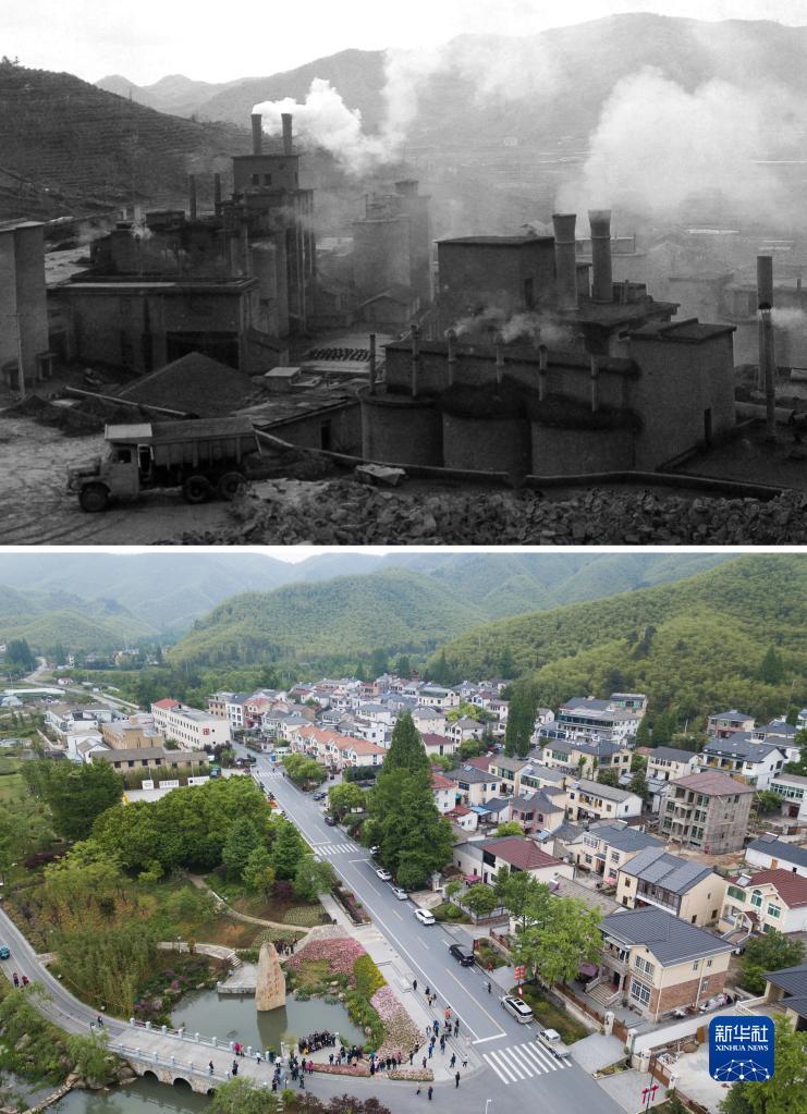 拼版照片:上图为浙江省湖州市安吉县天荒坪镇余村二十世纪八十年代的资料照片;下图为2018年4月24日,游客在整修一新的余村游览(新华社记者翁忻旸摄)。新华社