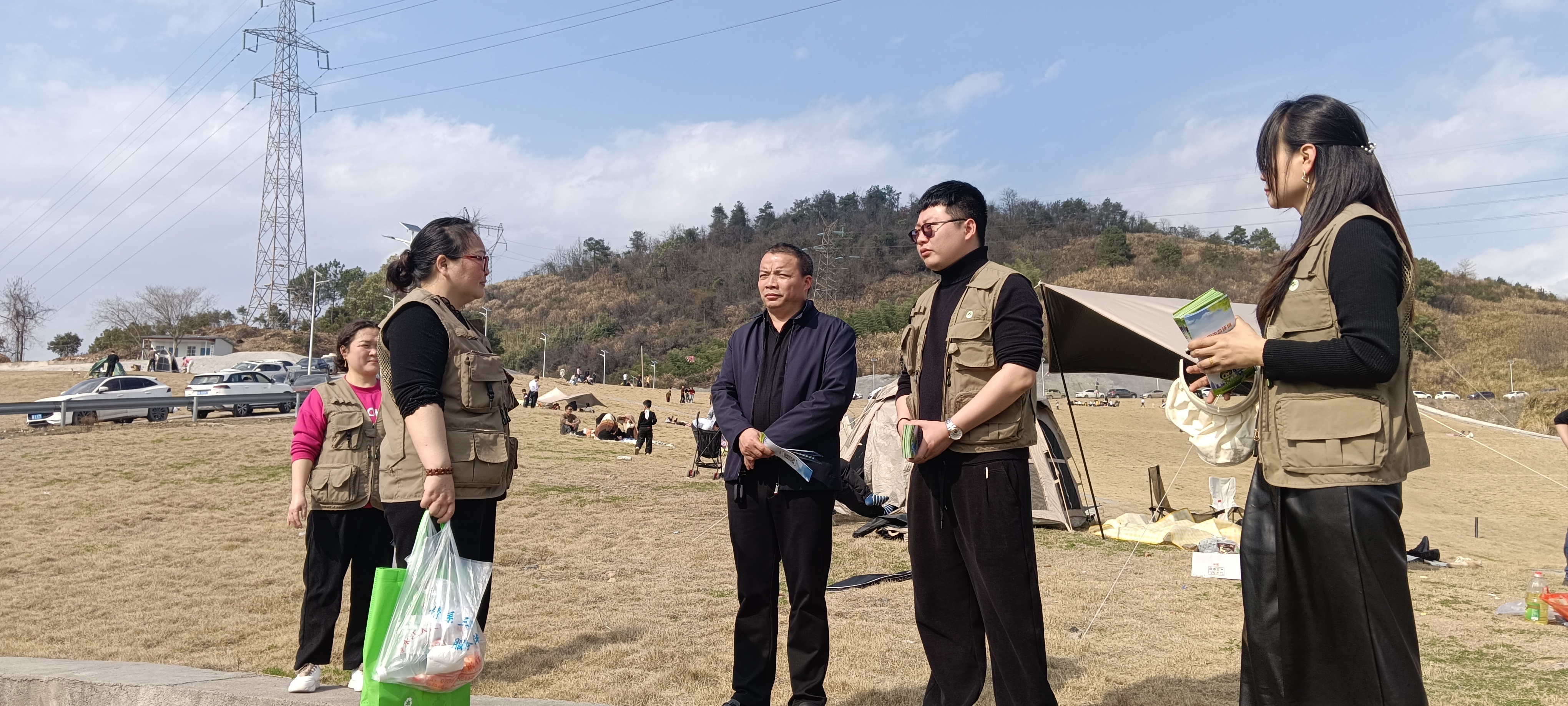 当日下午阳光明媚,清风微吹。省绿色卫士冷水江市大队的志愿者与冷水江街道办事处工作人员来到“永兴草原”中心区域,面对现场游客开展生态环境保护的宣传教育与劝导工作,发放由冷水江人民法院印发的“公民生态环境行为规范十条”,并就“永兴草原”制定相对应的常态化管理规定等事宜进行探讨。