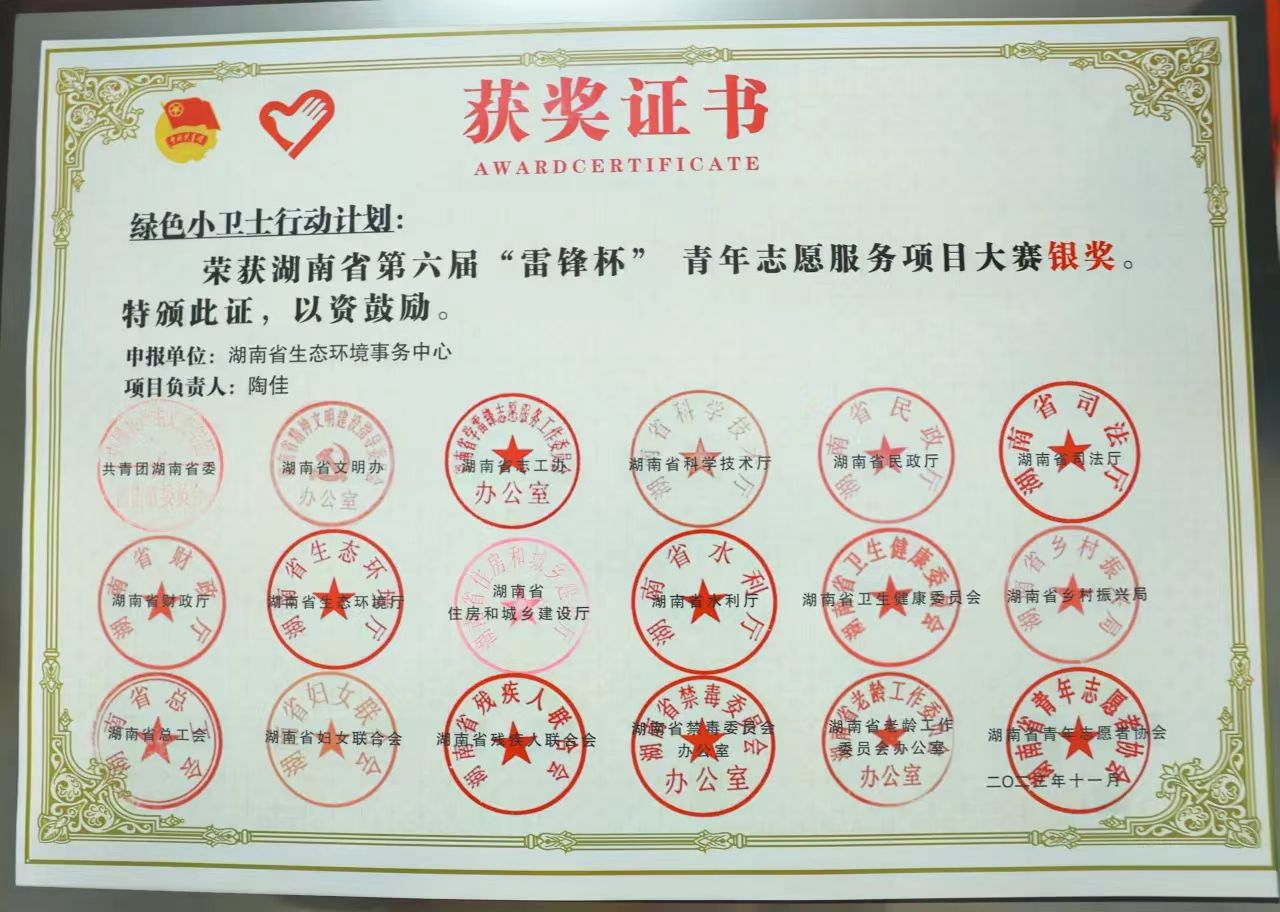 11月29日下午,湖南省“百万青少年学雷锋”志愿服务交流会暨第六届“雷锋杯”青年志愿服务项目大赛颁奖仪式在岳阳举行。省生态环境事务中心“绿色小卫士行动计划”荣获银奖,并在此次交流会上进行了志愿服务项目展示。该项目由省生态环境厅直属机关团委推报。
