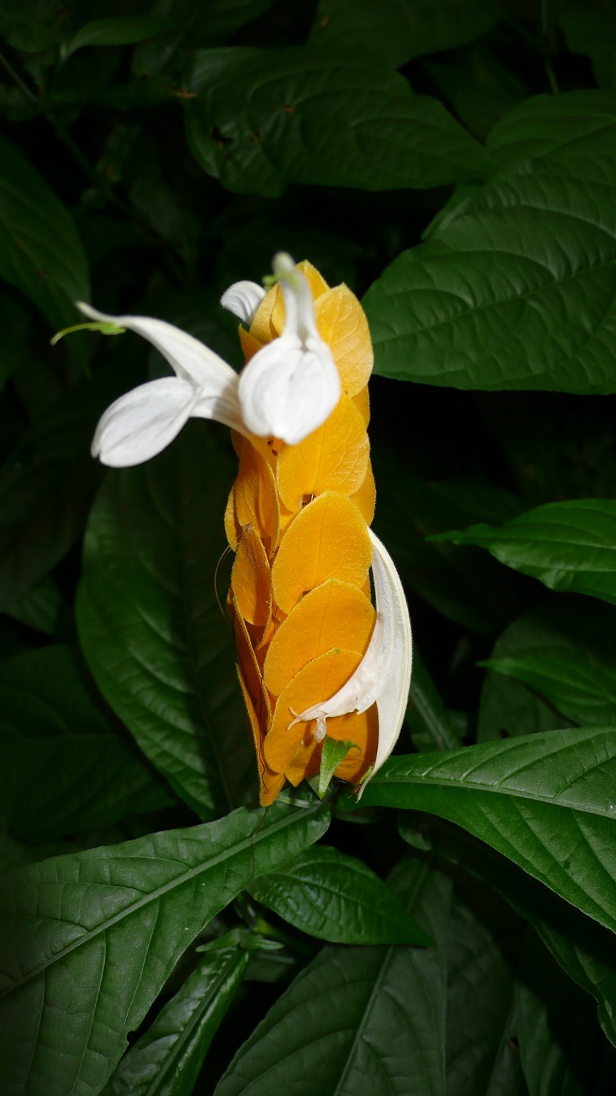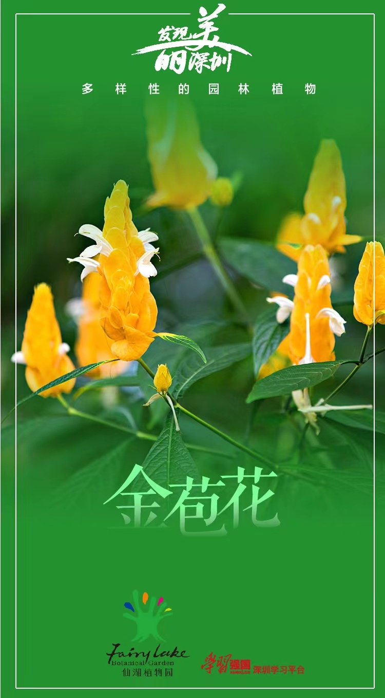 金苞花鲜黄色的苞片层层叠叠,从中伸出的白色花冠才是它真正的花。远望金苞花,如矗立的金色宝塔,近看如活蹦乱跳的虾子,故又得名“黄虾花”。