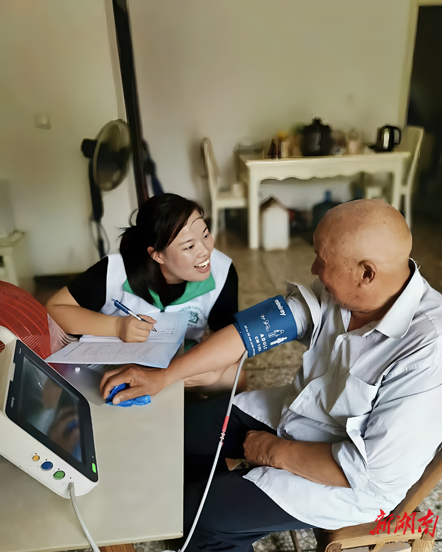 照片记录了雨花区志愿服务联合会的一名医疗志愿者走进乡村,为行动不便的老人提供上门健康服务的温馨场景。医生耐心测量血压、讲解保健知识,老人专注倾听,笑容朴实。画面展现了基层医疗的温情守护,传递了“健康入户”的民生温度,诠释了医者仁心的责任与担当。