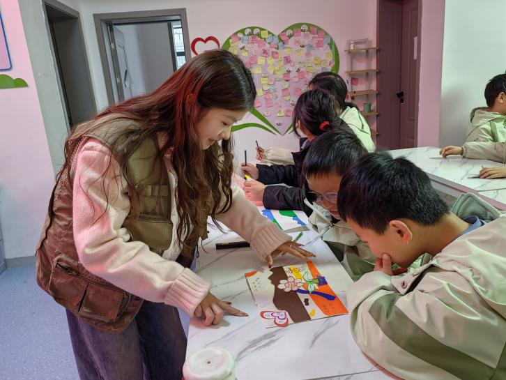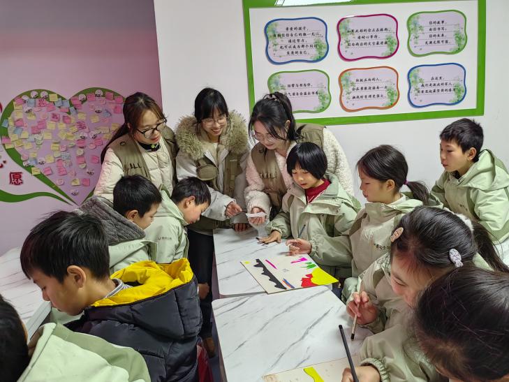 活动从一堂绘画课开始。大学生志愿者舒琼老师带来了《湿地生态好》创作课,为孩子们打开了认识湿地的一扇窗。课堂上,舒老师不仅带大家欣赏鄱阳湖等湿地的风景,讲解湿地作为“地球之肾”的重要作用,还把美育和生态知识结合起来,——从最基础的三原色讲起,演示如何调色,一步步引导孩子们用画笔和彩纸描绘心中的湿地。创作过程中,孩子们都很专注,互相帮忙:有的孩子画下芦苇摇曳的湿地轮廓,有的孩子用彩纸贴出五彩花朵装点家园……绘画过程中大家互帮互助,。小程同学积极帮忙整理画具;小瑞和小林在志愿者指导下完成了带有爱心元素的湿地画,用纯真的笔触表达了对大自然的热爱。展示环节,孩子们纷纷介绍自己的作品:“我画的是思蒙湿地的候鸟”“希望湿地永远绿绿的”,……用稚嫩的话语里满是表达了对家乡湿地的感情热爱。