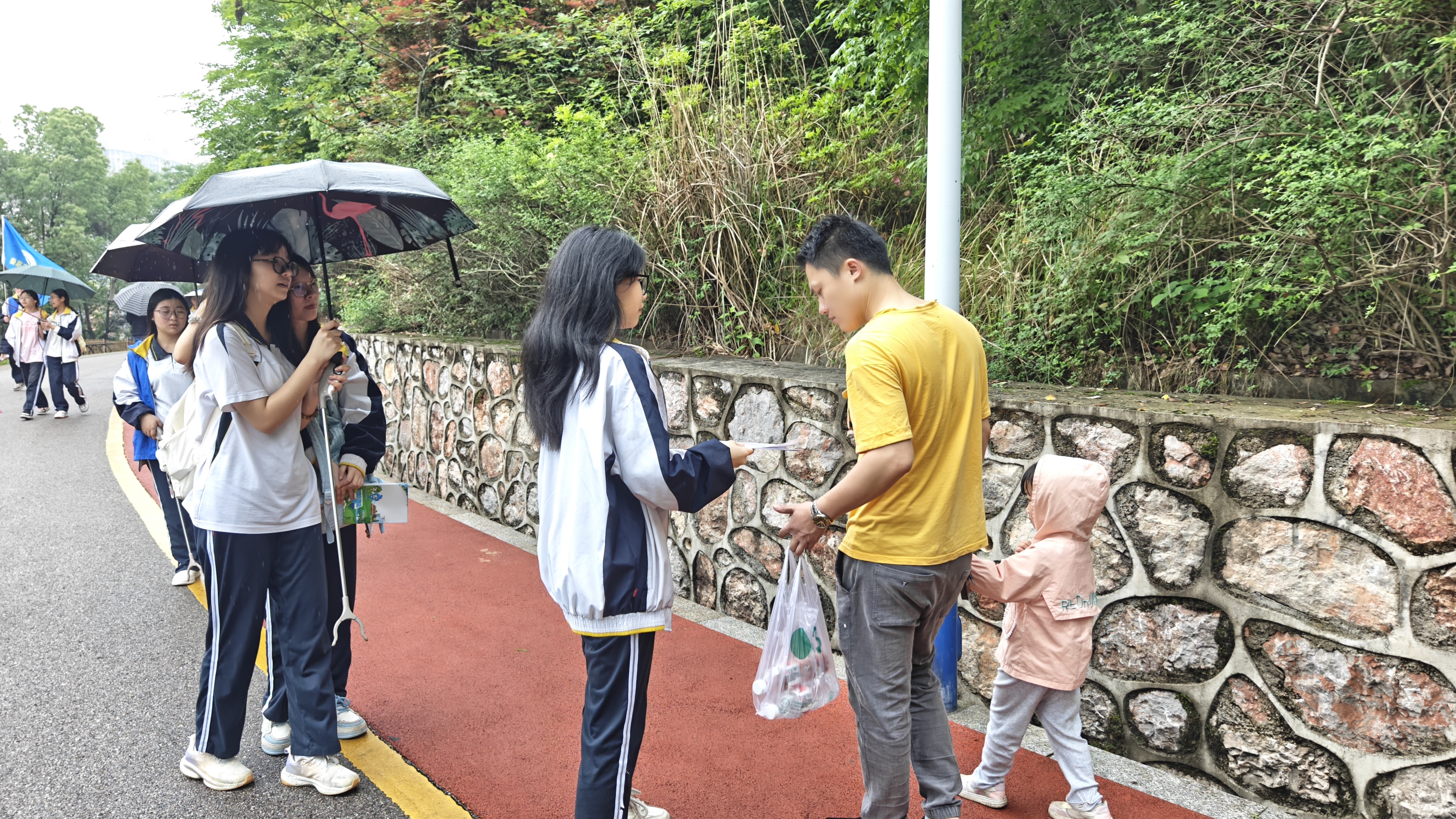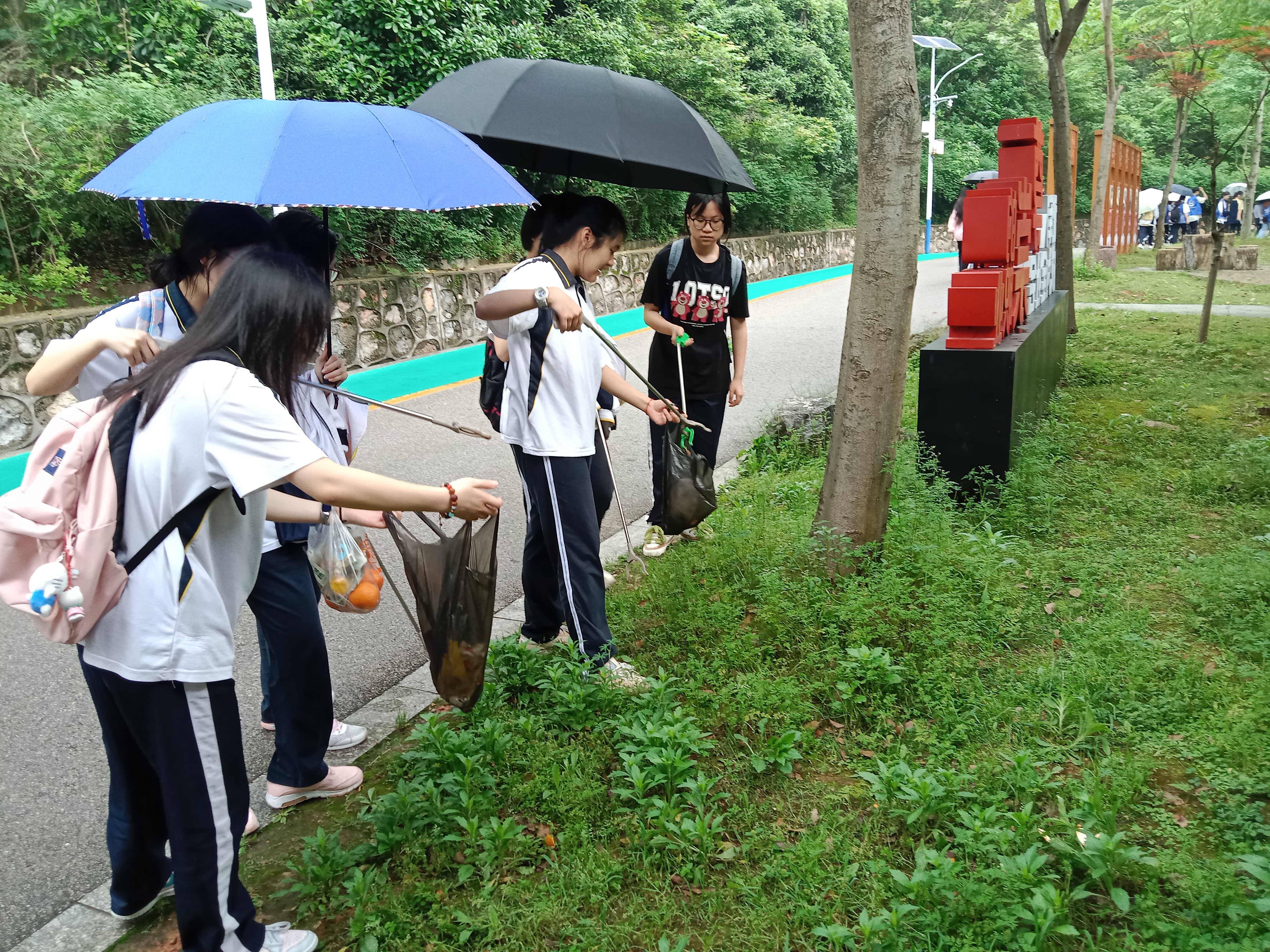 随后,在协会志愿者们的带领下,同学们沿着蜿蜒的珠山健步道开始净山行动,一开始,我们发现垃圾寥寥无几,大家不免感到有些“失落“,一旦发现有垃圾,就开始了“捡拾争夺战“,随着队伍的不断前行,路边草丛和排水沟里的垃圾也被同学们的火眼金睛给“扫射“出来,不时地听到有四处有同学在喊:“我捡到烟头了!”“我捡到槟榔渣了!”“我捡到塑料袋了!”“我捡到纸巾了!”……眼看着垃圾袋被一点点填满,我们也即将抵达终点。